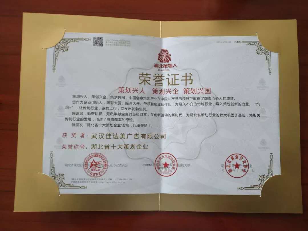 重磅!佳達美(měi)廣告榮獲“湖(hú)北(běi)省十大(dà)策劃 ✔& 企業(yè)”榮譽稱号